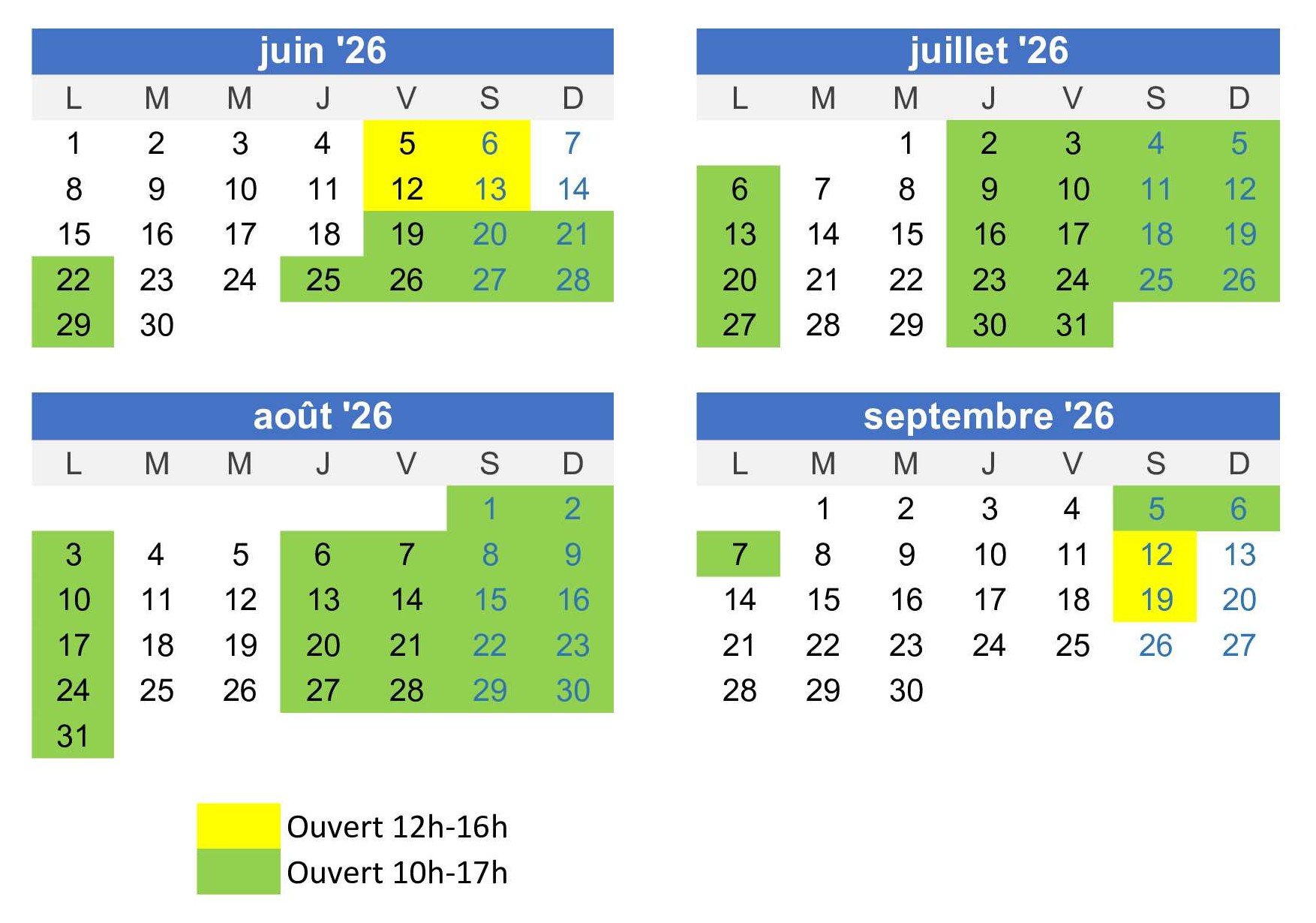 Pour la saison estivale nous serons ouverts du Jeudi au Lundi de 10h à 17h du 19 Juin au 31 Aout 2026. Fermé les Mardi et Mercredi chaque semaine.
